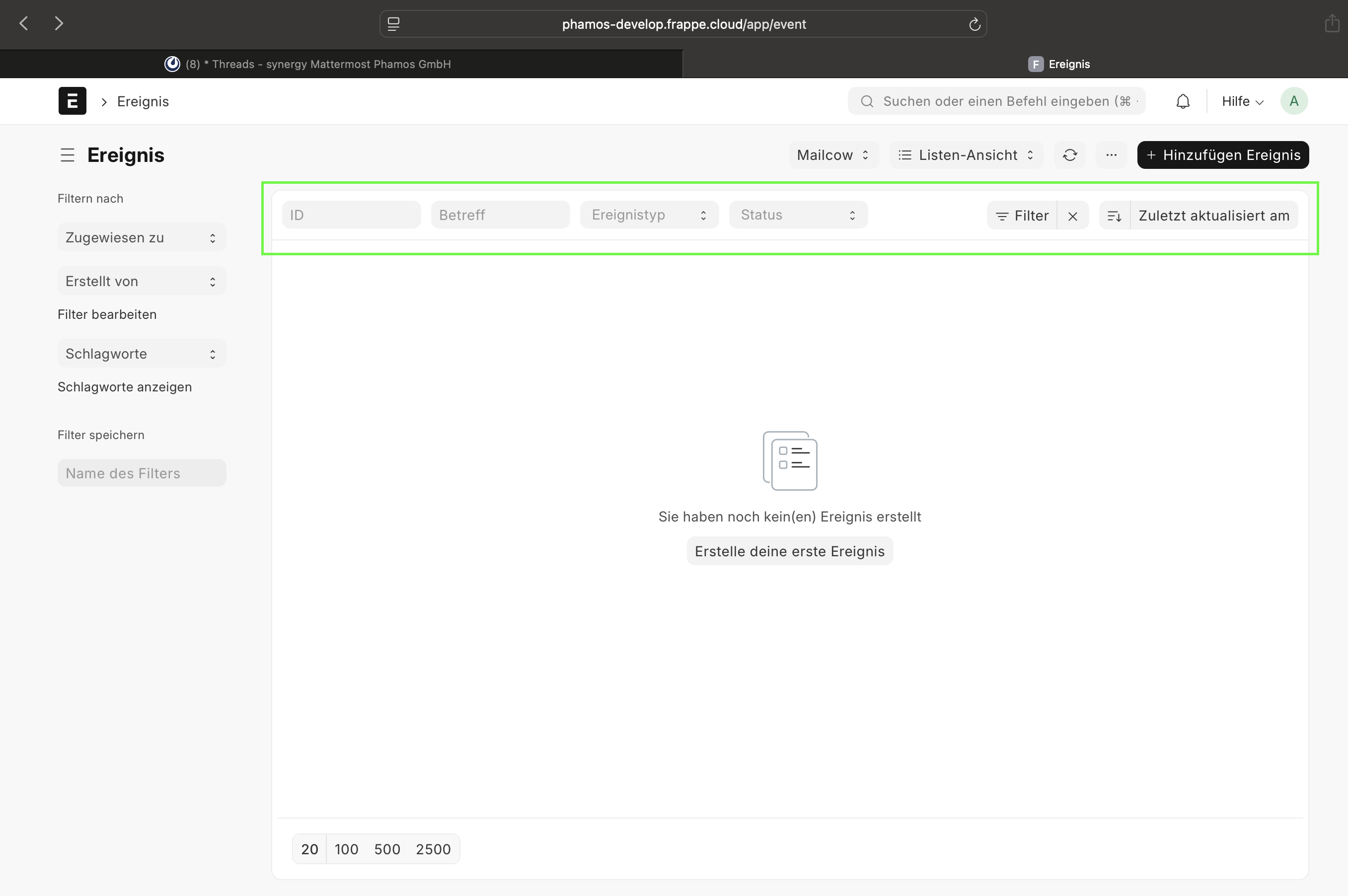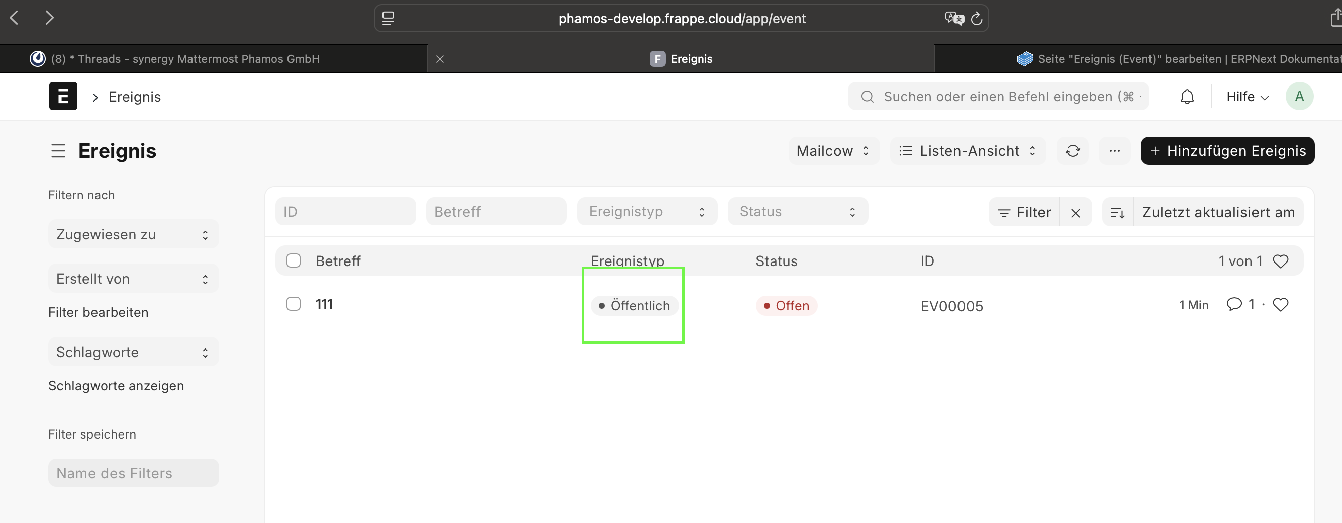Der DocType Ereignis wird in ERPNext als Termin der im starken Zusammenhang mit anderen Personen wie Interessenten, Mitarbeitern, Lieferanten oder Kunden steht. Für die bloße Planung von Ereignissen ist er nicht gedacht.