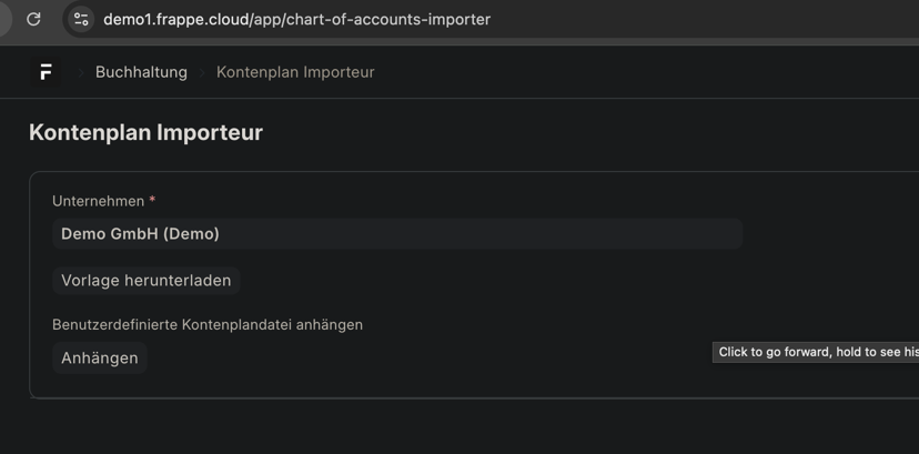 Dieser DocType ist ein Werkzeug mit welchem wir einen Kontenrahmen importieren können. Dies können wir jedoch nur für ein Unternehmen machen, welches noch keine Buchungen im Kontenrahmen enthält.